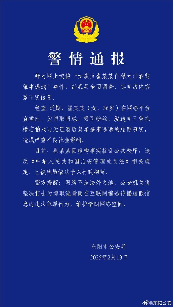 针对网上流传“女演员崔某某自曝无证酒驾肇事逃逸”事件,经我局全面调查,其自曝内容系不实信息。